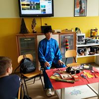 尼亚卢卡大学孔子学院教师吴坤开展武术和书法体验活动。